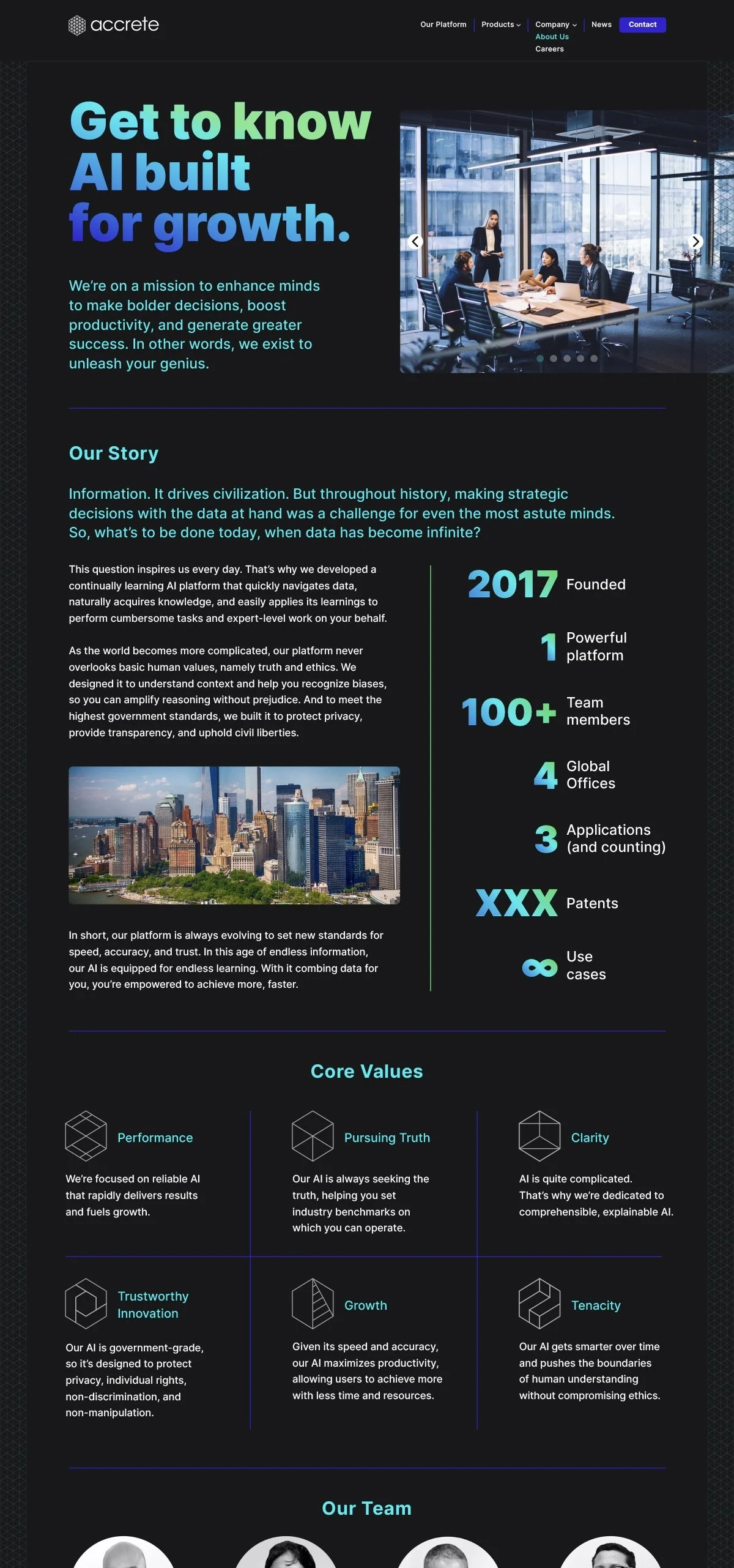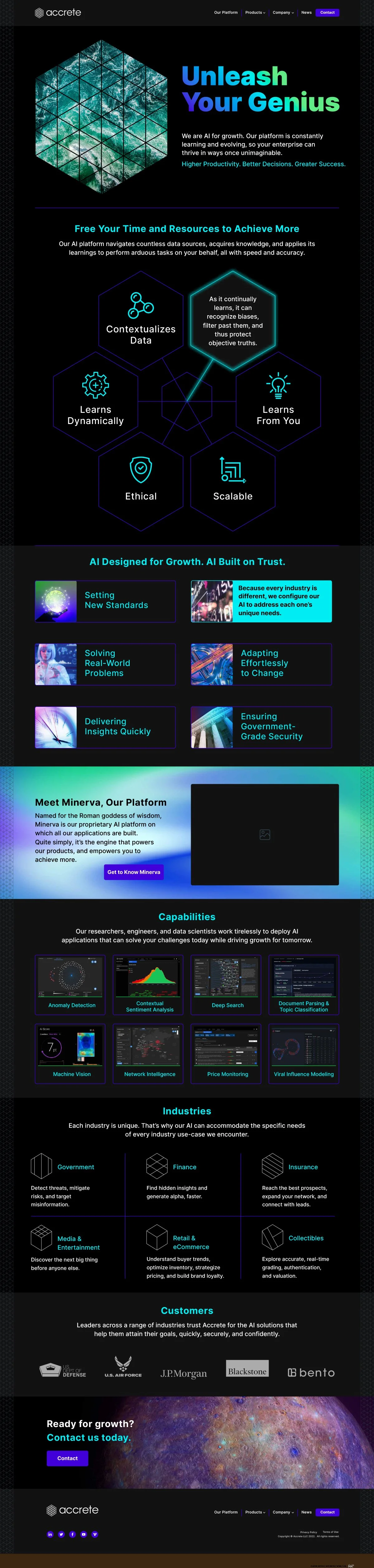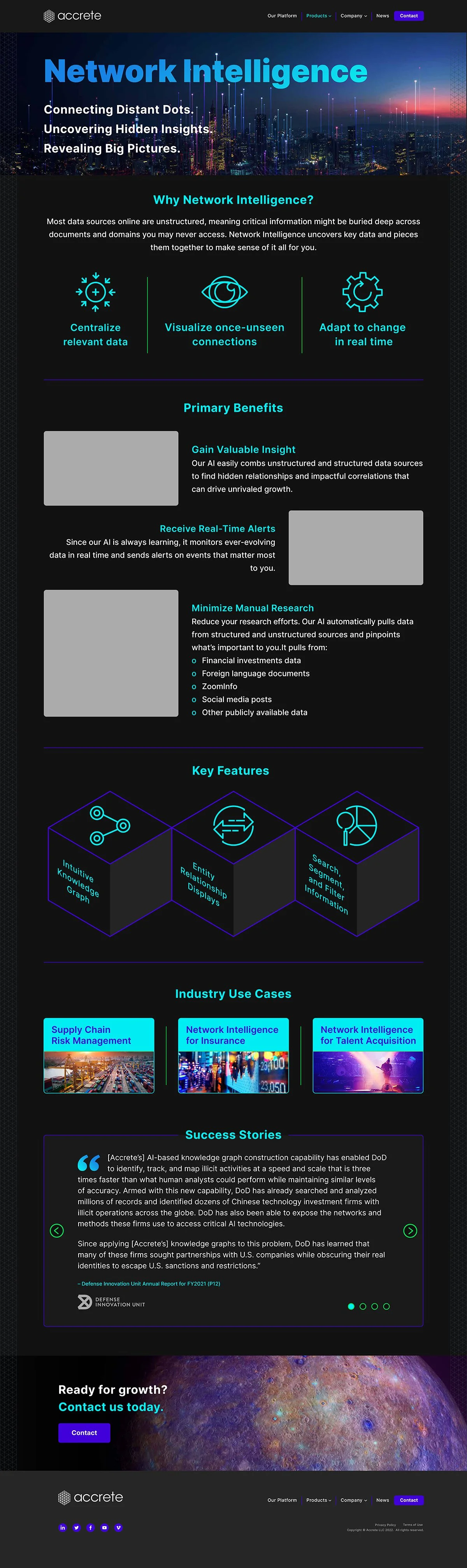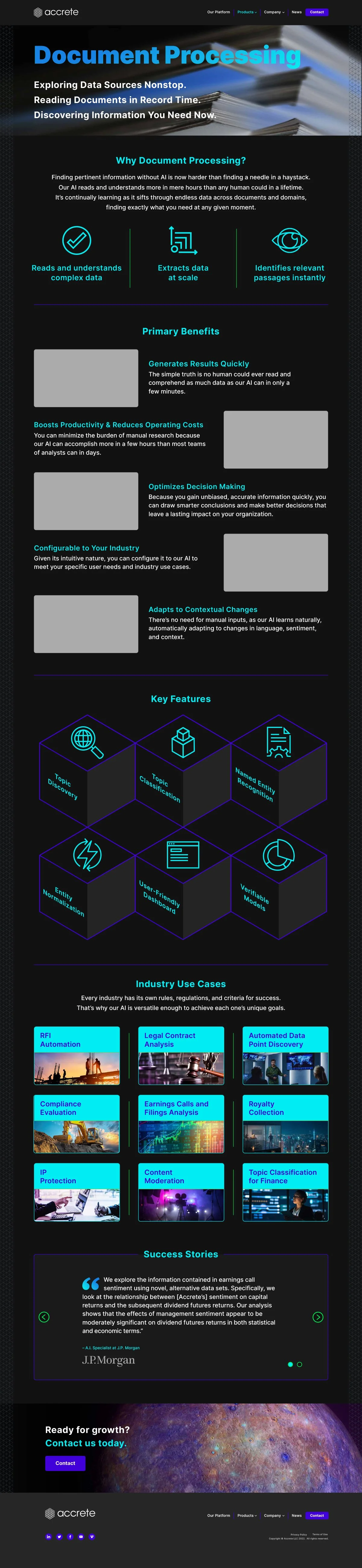 Working alongside AI developers and product designers, I wrote all new content for Accrete’s website. The goal was to make their platform comprehensible to casual visitors and potential invetors. The following are static images (functioning site will feature motion graphics, collapsing boxes, and animation) showcasing a few examples of pages.
